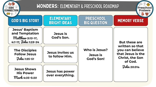 As we continue to grow in our faith and learn more about Jesus, our wonder and awe for Him can grow too! This month, kids will learn truths about who Jesus is and be challenged to discover their wonder for God’s Son. At Jesus’ baptism, God declared Jesus His beloved Son. Jesus resisted Satan’s temptations and proved His divine authority. People recognized Jesus’ power and chose to follow Him. Jesus calmed creation and cast out demons with only His words. His words and miracles showed that Jesus was not just a teacher, but truly the Son of God!